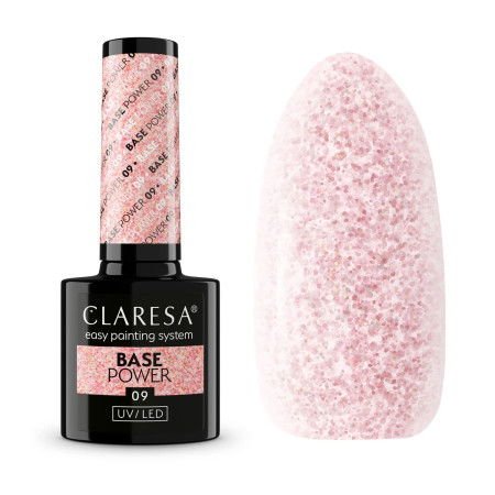 Claresa Power Base 09 je jemný růžový odstín s růžově zlatými vločkami. Tento bezkyselinový gelový podkladový lak je vhodný pro všechny typy nehtů, poskytuje vysokou přilnavost, trvanlivost až 3 týdny a odolnost proti odlupování.