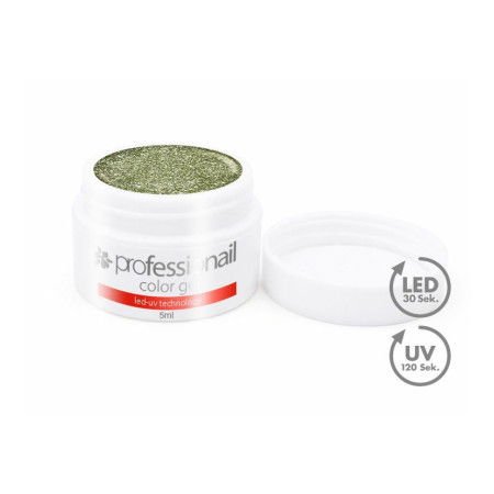 Barevný gel s glitry 0,1 mm zlaté barvy s výrazným holografickým efektem. Středně hustý, neprůhledný, barevný LED-UV gel. Velmi vysoká koncentrace glitrů, dokonalá samonivelační vlastnost. Gel nezpůsobuje pocit pálení v lampě