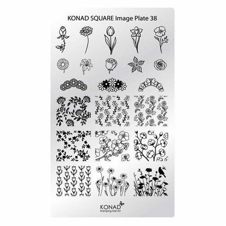 Razítkovací destička Konad Square 38 – elegantní květinové vzory pro jedinečné a sofistikované zdobení nehtů. Přesné gravírování a snadná aplikace. Vhodné pro přírodní i umělé nehty.