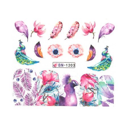 Akvarelové samolepky na nehty květiny a pávi BN-1203 – elegantní akvarelové samolepky s motivem květin a pávů a peří. Snadná aplikace a dlouhotrvající efekt dodají vaší manikúře jedinečný a sofistikovaný vzhled. Ideální pro domácí i profesionální použití.