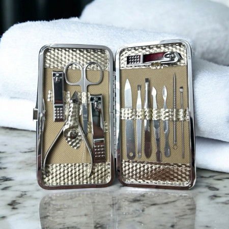 Devítidílná manikúrní sada s praktickým pouzdrem obsahuje nůžky na nehty, nůžky, pilník, pinzetu, zastřihovač kůžičky a další nástroje pro kompletní péči o nehty.