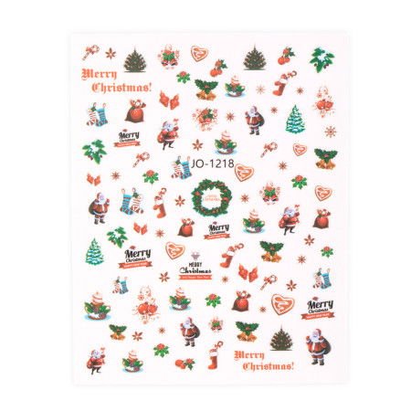 Vánoční samolepky na nehty JO-1218 s motivy sněhových vloček, stromečků a dárků. Rychlá aplikace pro dokonalý sváteční vzhled.