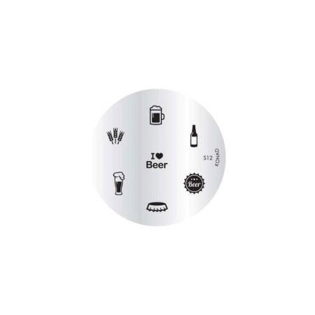Zdobiaca platnička KONAD S12 – originálna oceľová platnička s pivnými motívmi pre zábavné a štýlové pečiatkovacie zdobenie nechtov. Vhodná pre fanúšikov kreatívnych dizajnov.